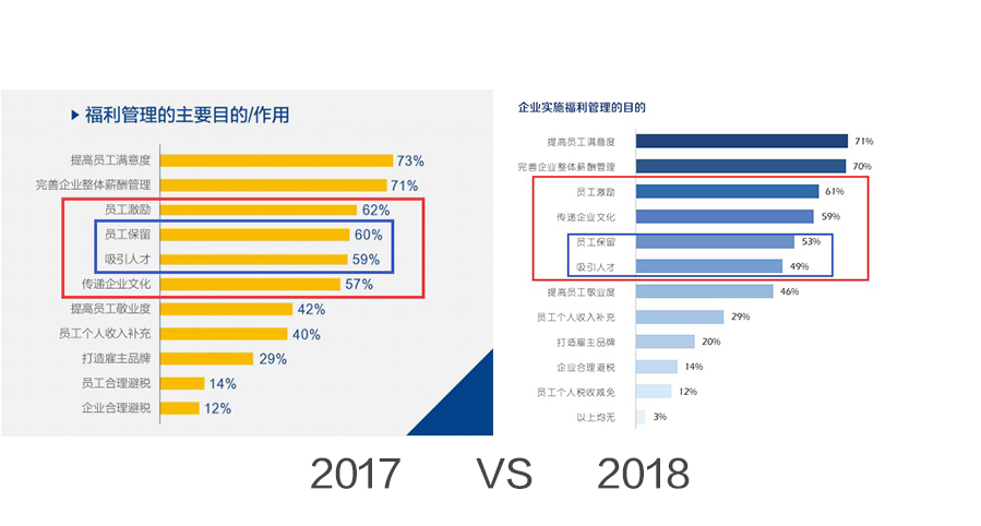 我們將2017年的調研數據和2018年的數據進行了對比。連續兩年的調研結果都顯示,多數企業認可福利對于員工激勵的作用。另外,2017年認為員工福利有助于員工保留的企業占53%,2018年為60%,增長了7%;2017年認為員工福利能吸引人才的企業占49%,2018年,這個數字增長了10%,達到59%。可見,越來越多的企業意識到福利在保留和吸引人才方面的重要性。
