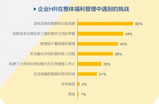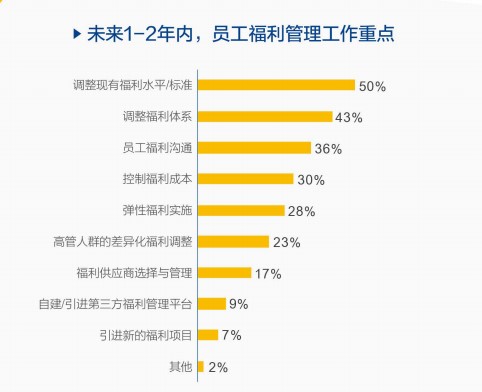 我們從調查中得知,雖然越來越多的企業認識到福利的重要性,但是目前在福利管理方面,企業面臨著各種各樣的問題,其中最普遍的呼聲就是:預算不夠。根據中智咨詢&中智關愛通的《2018-2019年企業福利管理實踐白皮書》,沒有足夠的預算和分配權限是企業在整體福利管理中普遍遇到的挑戰,60%的企業HR表示他們面臨這樣的難題。而在未來1-2年內的員工福利管理工作重點中,排在第一位的是調整現有福利水平/標準, 50%的企業HR認為這是重點。