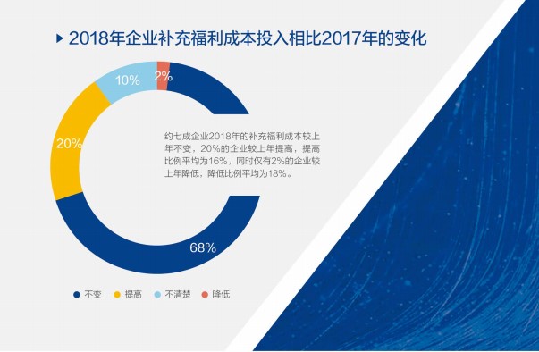 白皮書還顯示,約七成企業2018年的員工福利成本較上年不變,20%的企業較上年提高,僅有2%的企業較上年降低。雖然調整現有福利水平/標準是企業普遍認為的福利管理工作重點,但大部分企業的福利成本卻依然維持穩定的狀態,只有小部分企業提高了福利成本,整體的漲幅十分緩慢。可見,沒有足夠的預算確實制約了企業在福利方面的投入。
