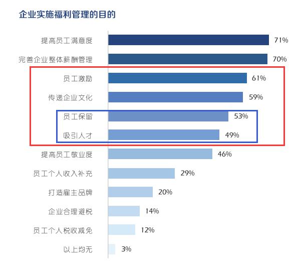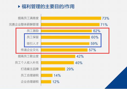 2018德勤全球人力資本趨勢調(diào)研的結(jié)果,也證實(shí)了福利的激勵(lì)作用。61%的受訪企業(yè)表示,福利提高了員工的工作效率及最終的業(yè)務(wù)成果;60%的受訪企業(yè)表示福利提高了員工的保有率。