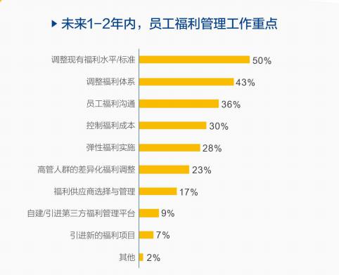 雖然越來越多的企業(yè)認(rèn)識到福利的重要性,但是目前在福利管理方面,企業(yè)面臨著各種各樣的問題。根據(jù)中智咨詢&中智關(guān)愛通的《2018-2019年企業(yè)福利管理實(shí)踐白皮書》,沒有足夠的預(yù)算和分配權(quán)限是企業(yè)在整體福利管理中普遍遇到的挑戰(zhàn),60%的企業(yè)HR表示他們面臨這樣的難題。而在未來1-2年內(nèi)的員工福利管理工作重點(diǎn)中,排在第一位的是調(diào)整現(xiàn)有福利水平/標(biāo)準(zhǔn), 50%的企業(yè)HR認(rèn)為這是重點(diǎn)。